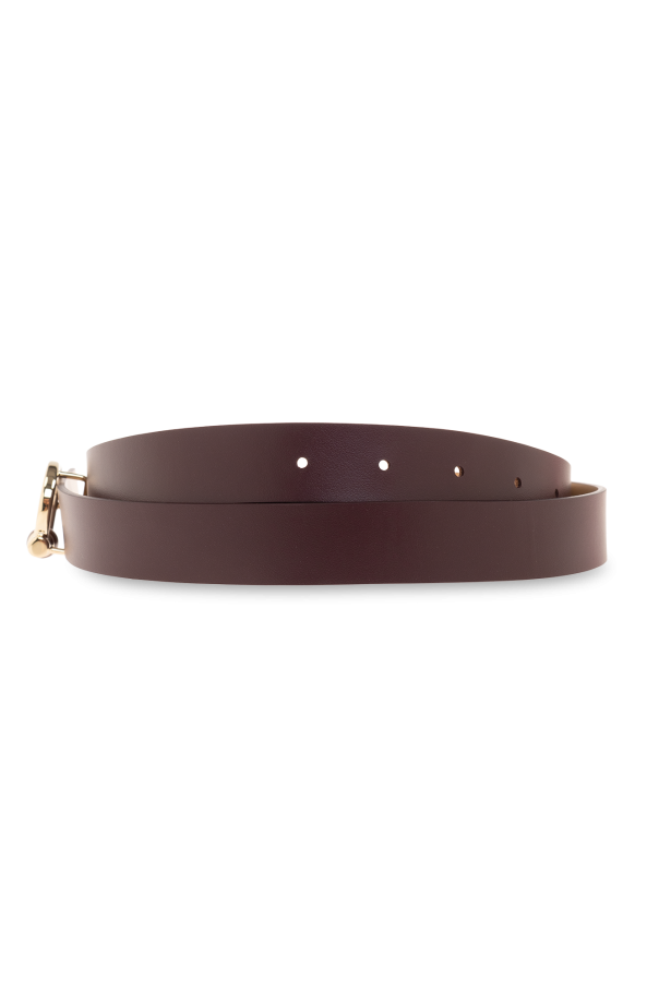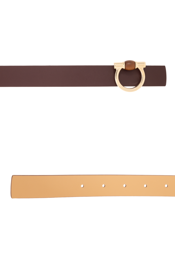 Reversible ‘Dinna’ belt in maroon and beige from FERRAGAMO. Made of leather, this item is decorated with a Gancini logo detail.