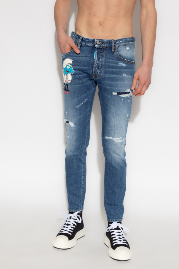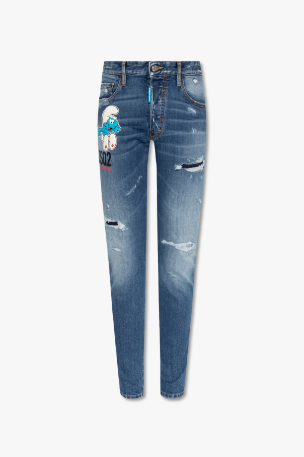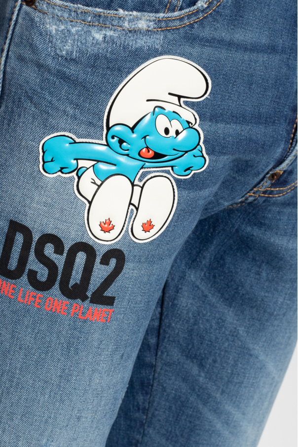 Blue ‘Skater’ jeans from Dsquared2 x The Smurfs, the ‘One Life One Planet’ collection. Made of cotton with a vintage effect, this pair fall with tapered legs and features button fastenings, classic five jean pockets, colourful patches and graphic prints with a motif of ‘The Smurfs’ comic franchise and a black patch with an embossed logo at the back.