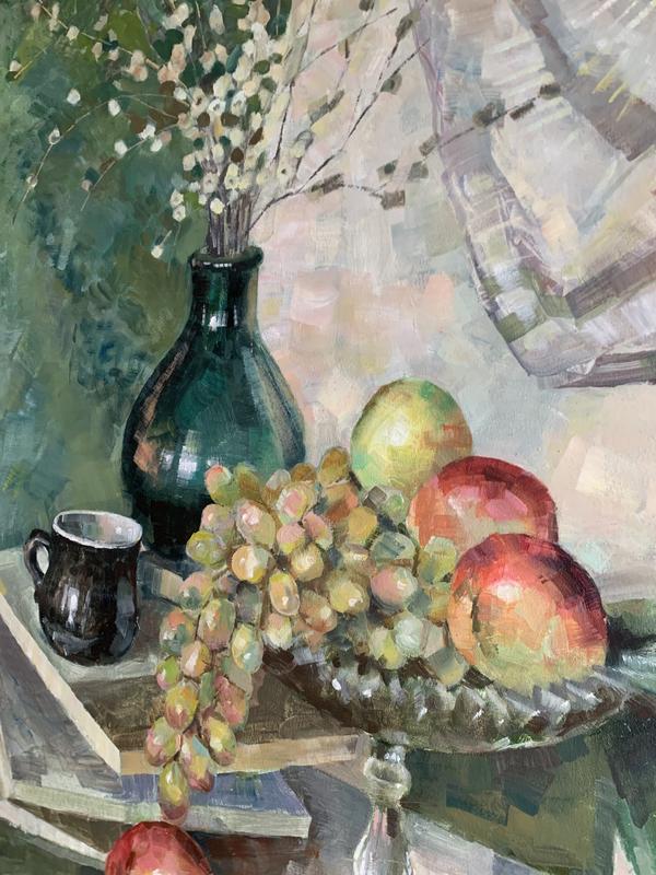 Картина «Весняний натюрморт»: ручна робота, виконана олійними фарбами професійною художницею. Розмір 80х60 сантиметрів. Написана на ґрунтовному дереві. Яскрава і живописна: буде освіжити Ваш інтер‘єр.