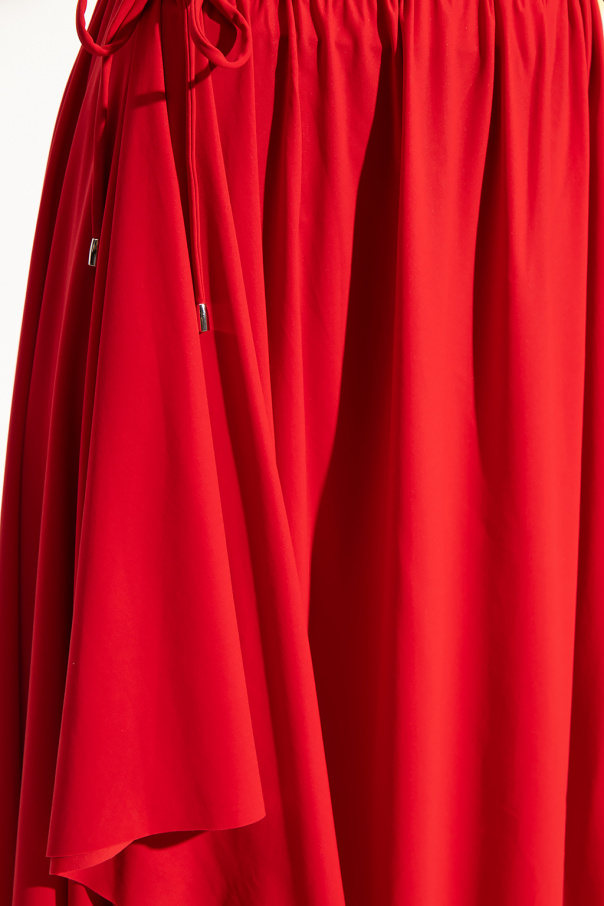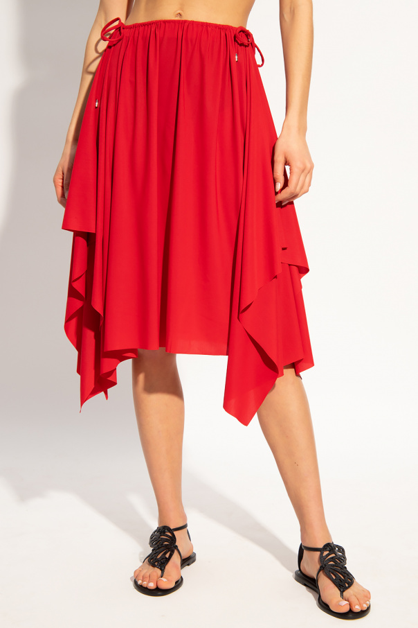 Red skirt from Pain de Sucre. This design features an elastic drawstring waistband, decorative gathers and a raw cut edge.