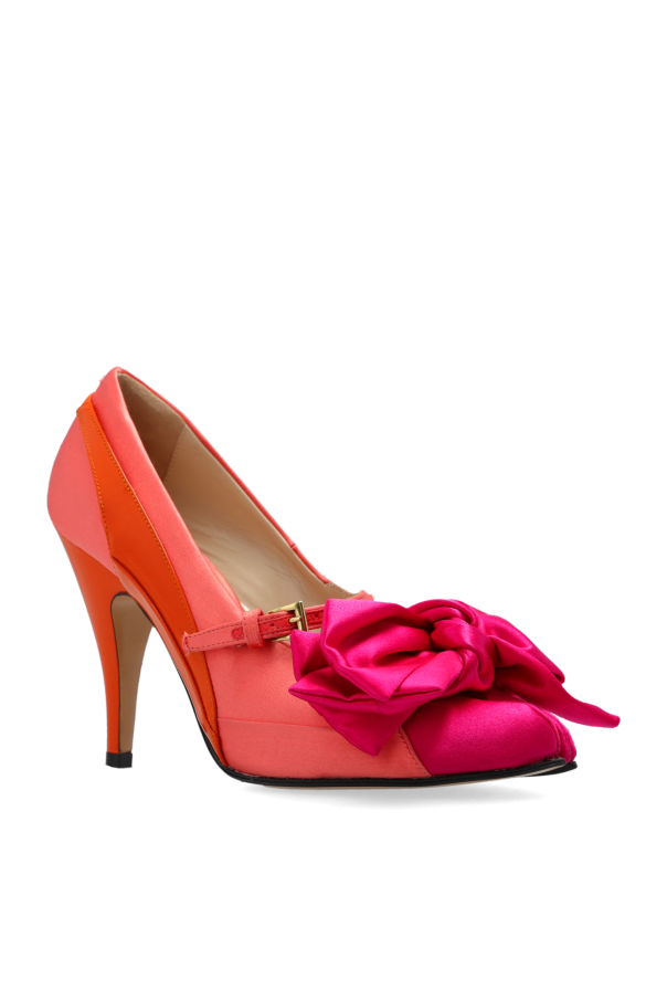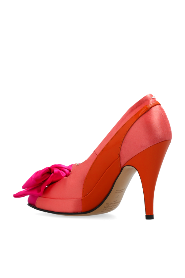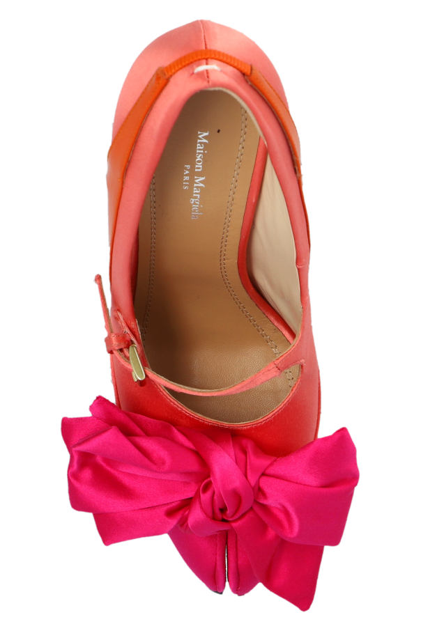 Pink and orange ‘Tabi Monster’ pumps from Maison Margiela. Made of leather and fabric, this pair features a bow, Tabi toe, buckle strap and beige leather sole.