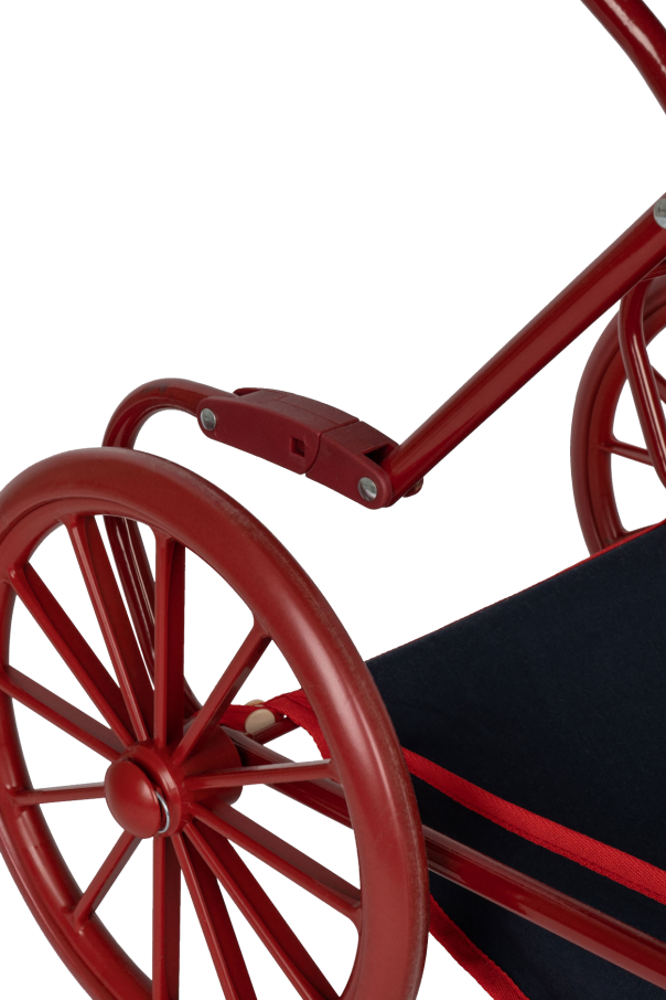 Navy blue and red doll stroller in vintage style from Konges Slojd. The frame is made of metal with spongy soft handles. It is equipped with four large wheels made in EVA material for extra stability. The quilted printed fabric and a mattress made in 100% organic cotton. Comes with a softly cushioned storage basket under the lift. This item comes fully assembled and is easy to fold and store.