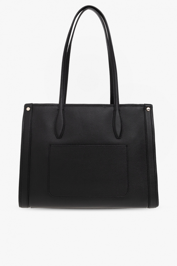 Black ‘Market Medium’ shopper bag from Kate Spade. Crafted from grained leather, this design features a zip fastening, a metal logo plaque on the front, two half-round handles, an attached brown keyring, light gold-tone metal hardware and one internal compartment with one slip pocket and one zip pocket.