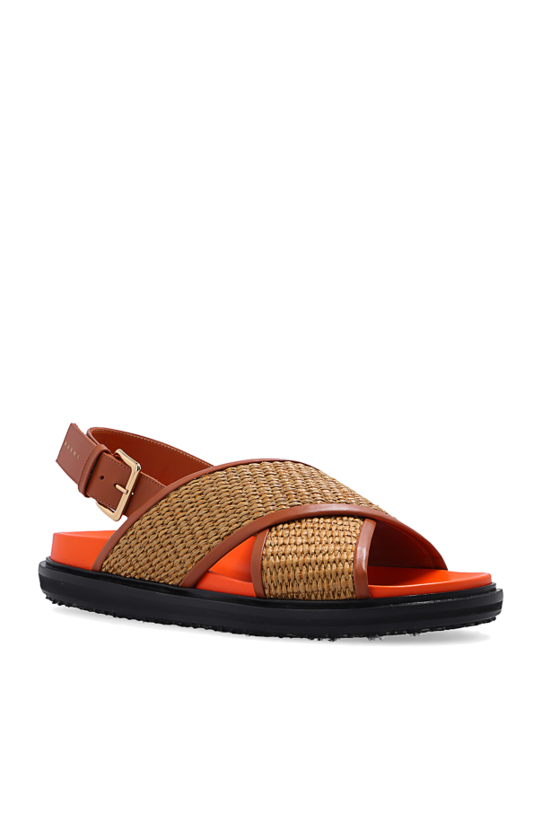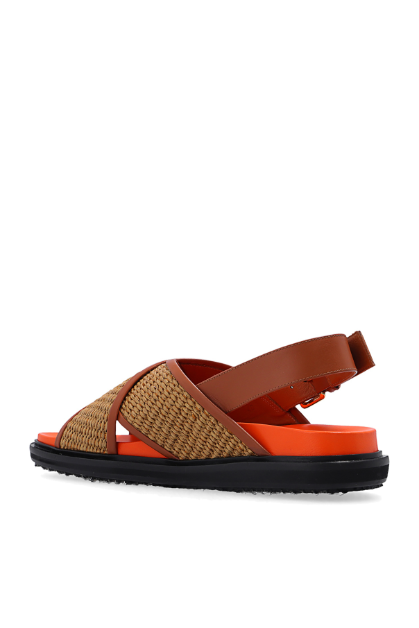 Brown, orange and black ‘Fussbett’ sandals from Marni. Constructed from crisscross leather straps trimmed with woven raffia, this model features a logo-printed buckle strap, a contrasting insole and a black rubber sole with a jute overlay.