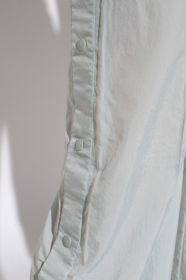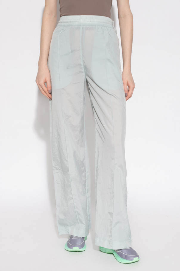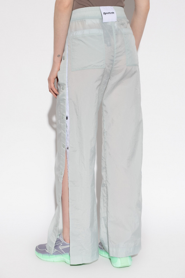 Light green trousers from Reebok x Victoria Beckham. Made of recycled fabric, this pair features an elastic waistband with drawstrings, white and black logo patch, two slip pockets, snaps on the sides and slightly flared legs.