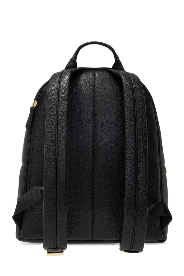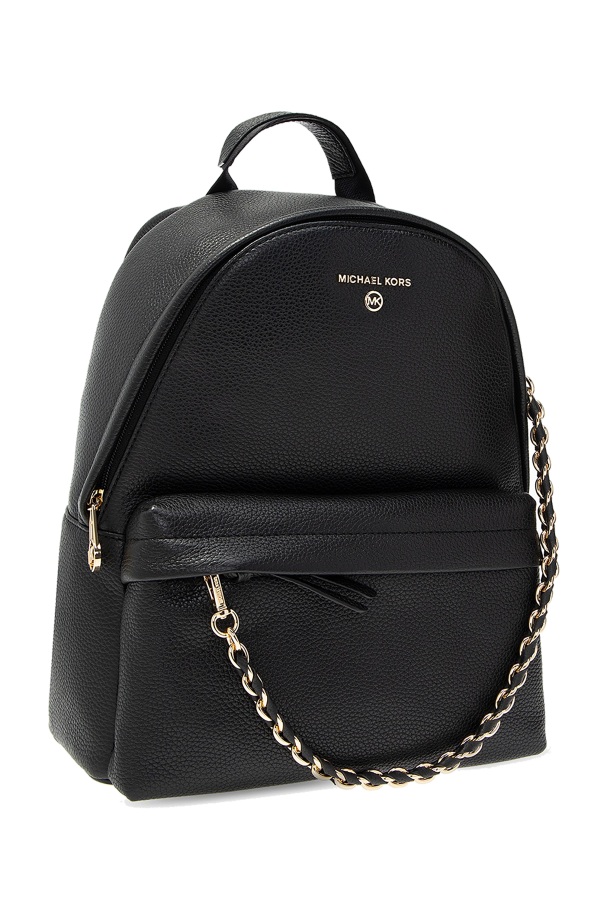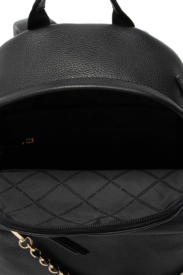Black backpack from Michael Kors. Emblazoned with gold-tone metal logo plaque and a distinctive chain, this leather-crafted design is complete with an external zip pocket on the front, adjustable shoulder straps and interior with one compartment and one zip pocket.