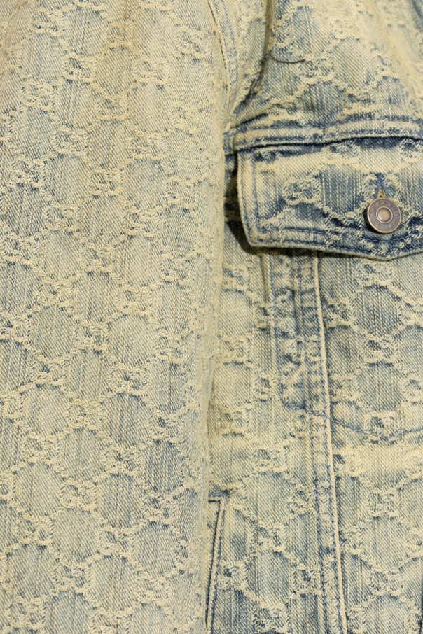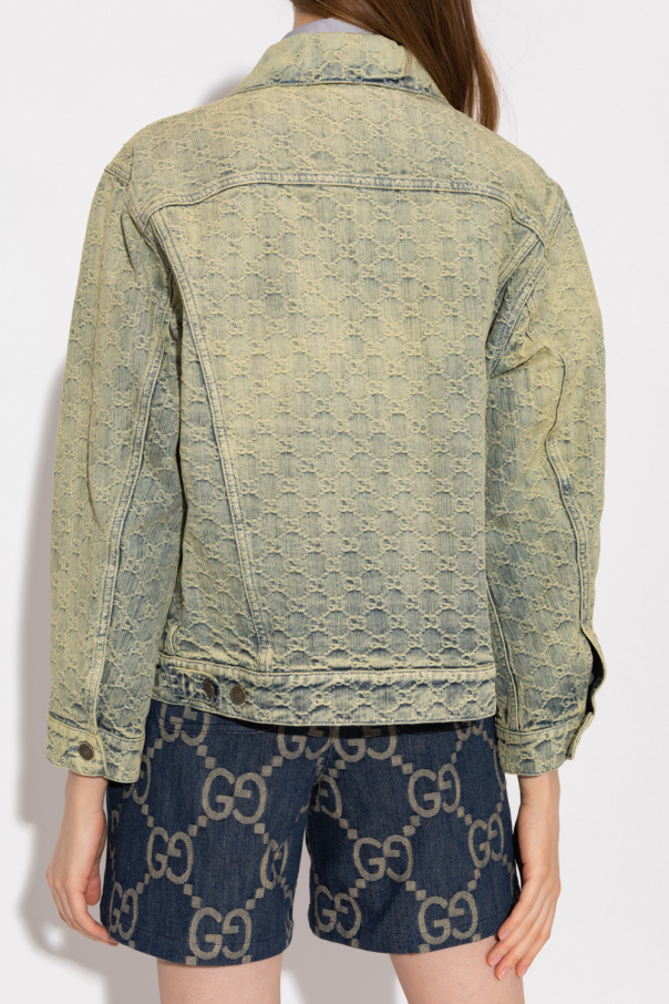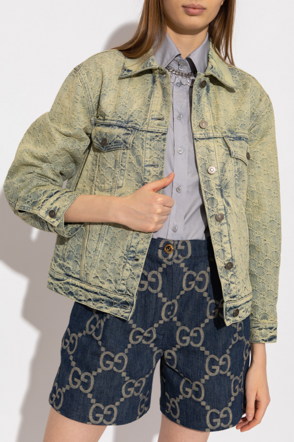 Beige and light blue denim jacket from Gucci. Crafted in GG cotton jacquard, this style features button fastenings, two side welt pockets, two flapped button chest pockets and long sleeves with button cuffs.