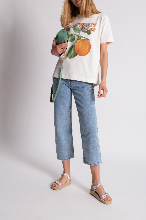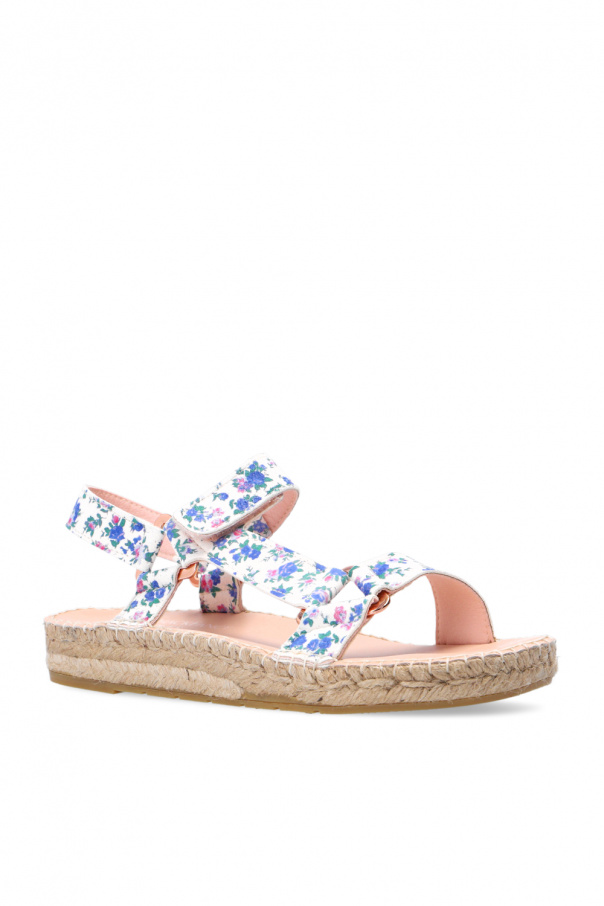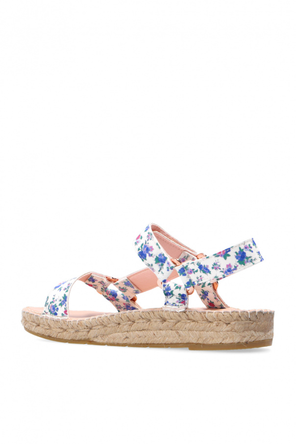 Cream and beige sandals from Manebi x LoveShackFancy, the ‘LoveShackFancy Loves Manebí’ collection. Crafted from suede, this model showcases a blue, pink and green floral pattern, a velcro fastener and decorative rose gold-tone inserts. The sole was made of natural jute trimmed with a thin layer of beige caoutchouc.