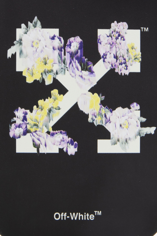 Black iPhone 13 case from Off-White. Designed to guard your smartphone, this item showcases the brand\'s signature arrows accompanied by a logo in white and a colourful floral motif.