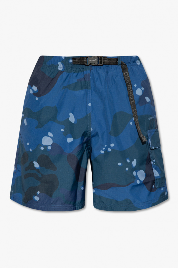 Blue, navy and dark green swim shorts from Off-White. This pair features an elastic waistband with a black branded stripe, two slip pockets, one zip pocket and velcro pocket with a flap.