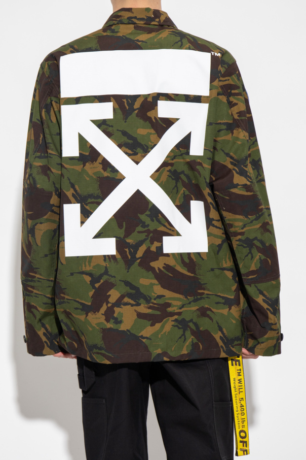 Green, brown and beige jacket from Off-White. Made of cotton, this garment features button fastenings, camo pattern, four flap pockets, multicolored sleeve patches and white logo print at the back.