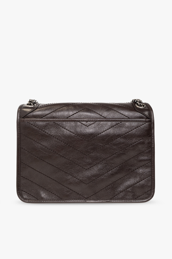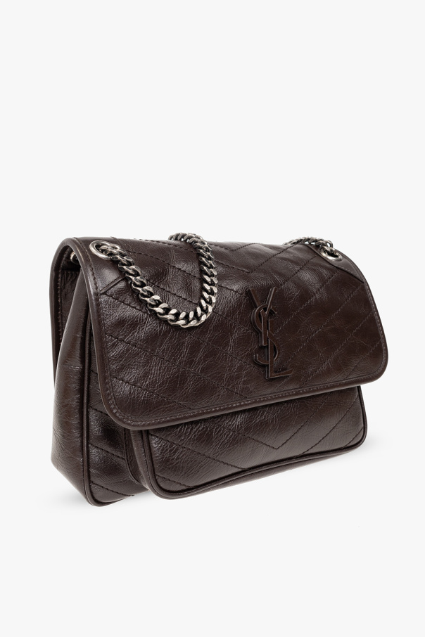 Dark brown ‘Niki Medium’ shoulder bag from Saint Laurent. Crafted from calf leather with a cracked effect, this design secures with a magnetic snap and showcases a metal logo plaque on the front, a back slip pocket, a long chain strap intertwined with leather, antiqued silver-tone metal hardware and one internal compartment with two slip pockets and one zip pocket.