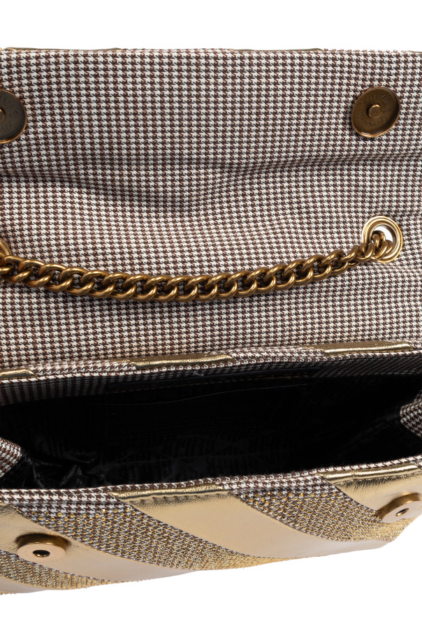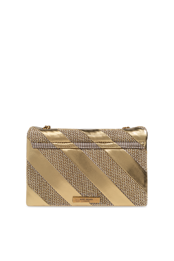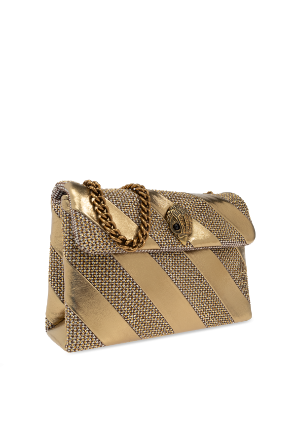 Introducing the Kensington Shoulder Bag, an epitome of elegance and luxury from the renowned British designer Kurt Geiger. This exquisite bag, crafted for discerning women, stands out with its opulent golden hue and sophisticated design. Constructed from premium materials, the exterior features a harmonious blend of golden and shimmering elements interwoven with textured fabric in shades of brown and gold. The bag\'s surface is adorned with diagonal golden stripes, adding a touch of refined glamour. The Kensington bag boasts a rectangular shape with a top flap, secured by an ornate animal-inspired clasp embellished with delicate crystals. A golden chain strap further accentuates its elegant appeal, while the discreet designer logo on a golden metal plate at the back adds a subtle hint of exclusivity. Inside, the bag is lined with a chic houndstooth pattern and includes additional pockets for small essentials, ensuring both style and practicality. The magnetic snap closure provides ease of access while maintaining security. Why Buy This Product? Exquisite blend of golden, cream, and brown tones. High-quality materials ensuring durability and luxury. Elegant diagonal stripe design. Animal-inspired clasp with crystal embellishments. Golden chain strap for a sophisticated look. Functional interior with additional pockets. Discreet designer logo for a touch of exclusivity.