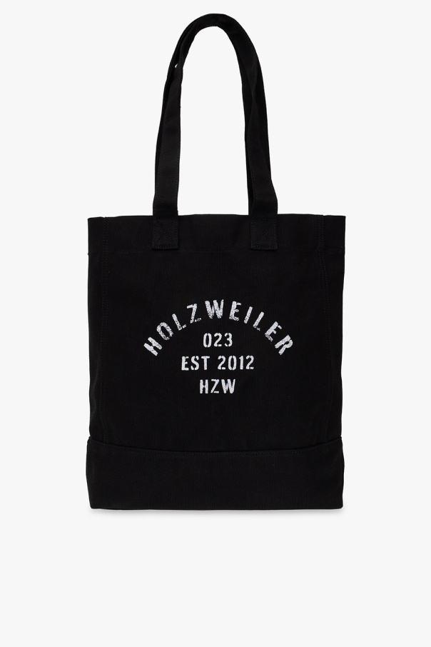 Black \'Alta\' shopper bag from Holzweiler. Crafted from cotton canvas, this design showcases a printed white logo, two half-round handles, black metal hardware and one internal compartment with a zip pocket.