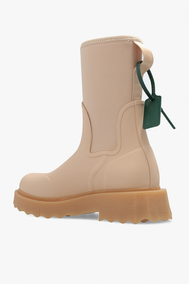 Light pink ‘Sponge’ rain boots from Off-White. Resting on a beige rubber sole, this pair features a purple ‘FOR RAINY DAYS’ print and the brand’s signature zip tie in dark green.
