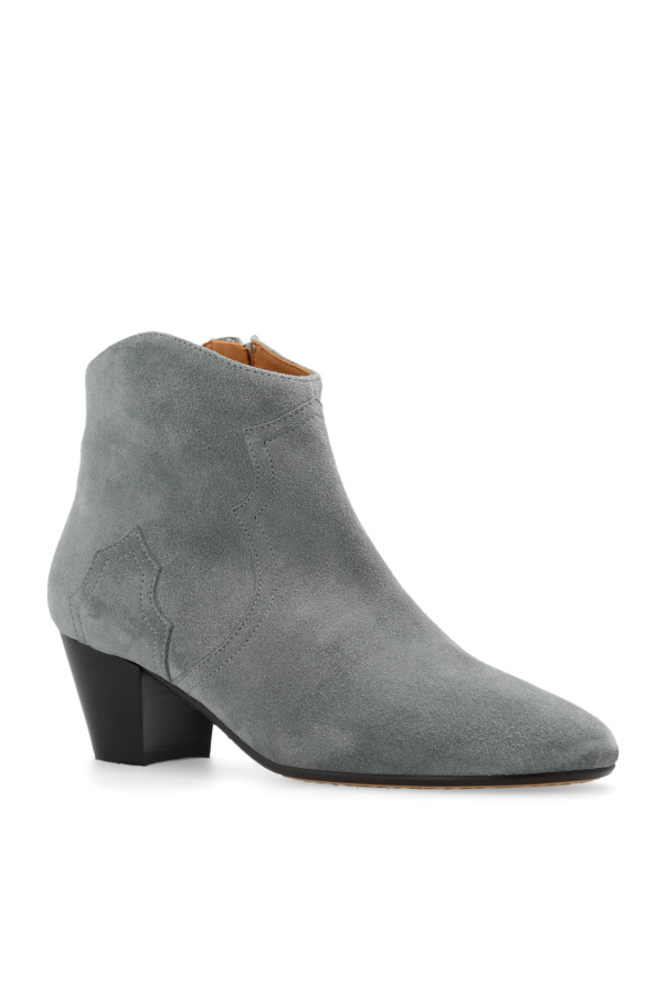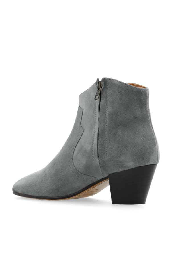 Greyish green ‘Dicker’ heeled ankle boots from Isabel Marant. Made of calf suede, this pair features a side zip and a brown leather sole.