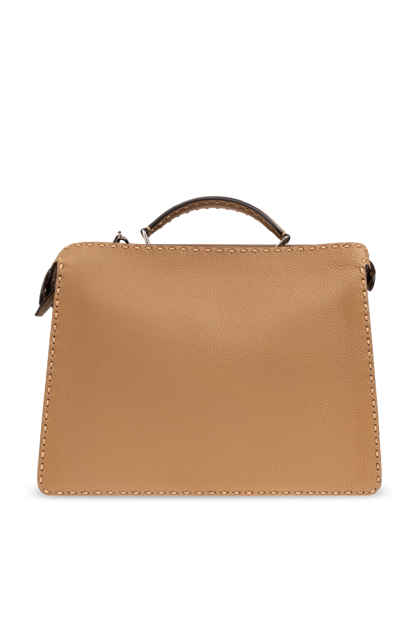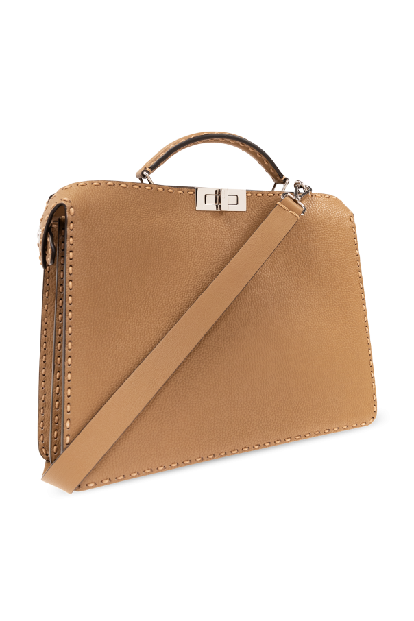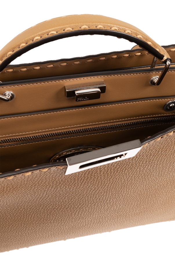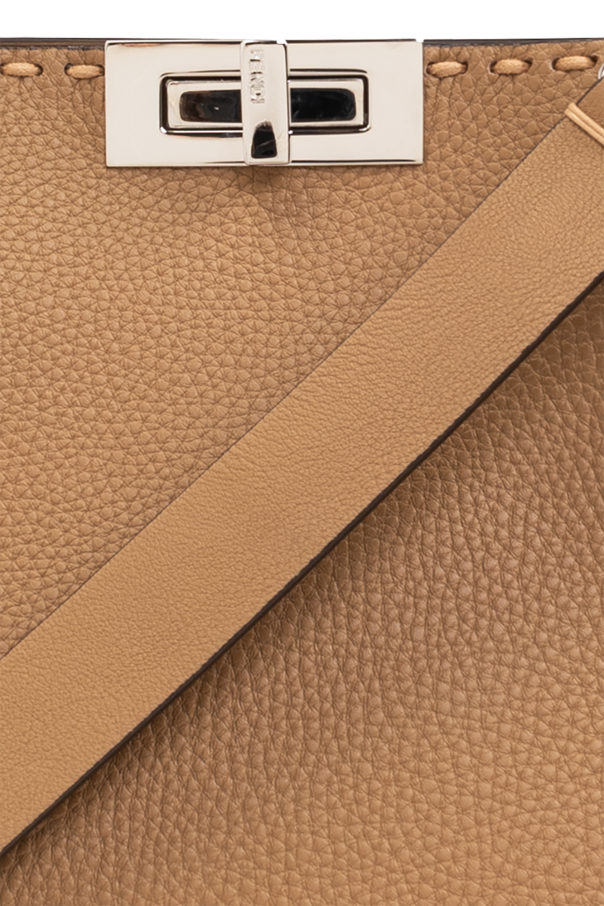Brown ‘Peekaboo Medium’ shoulder bag from Fendi. Made of leather, this design features two separate compartments – one fastens with a logo-engraved twist closure, the other via a zip. It is complete with a detachable and adjustable strap, one half-round handle, decorative stitching details, silver-tone metal hardware and a removable zip pouch inside.