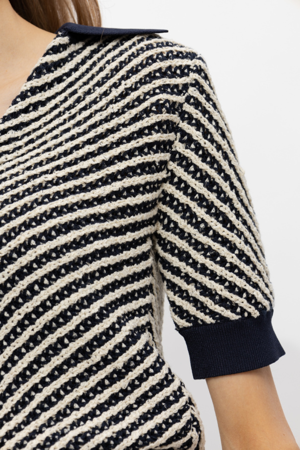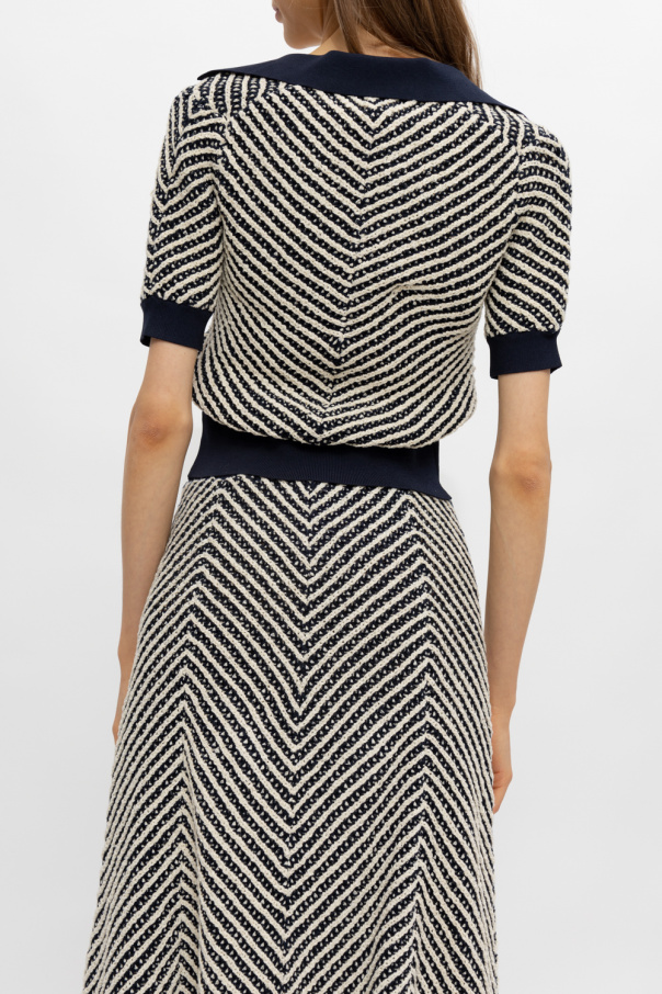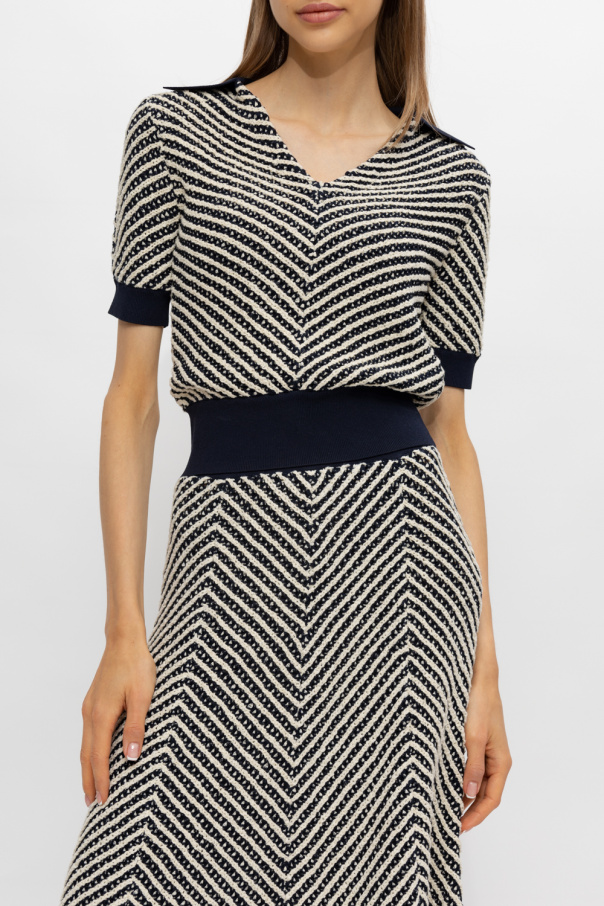 Navy and cream woven top with a collar from Tory Burch. Made of cotton, this short sleeve design has a ribbed hem and cuffs.