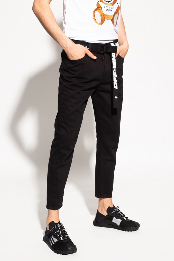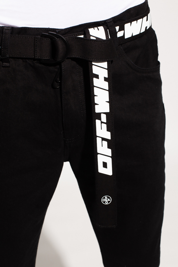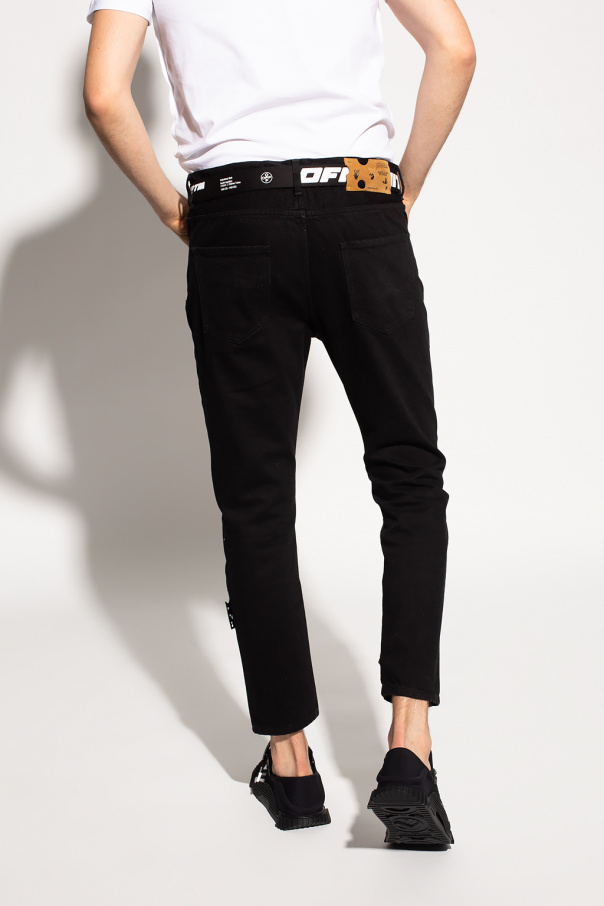 Black jeans from Off-White. Falling to tapered legs, this pair features an elasticated waistband, a zip fly with a button, classic five pockets, a brown logo patch and an included belt.