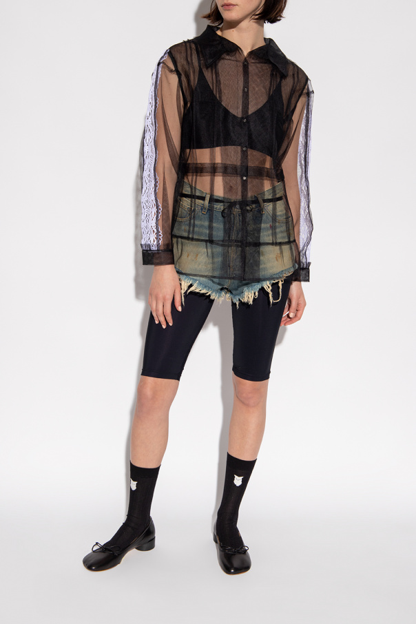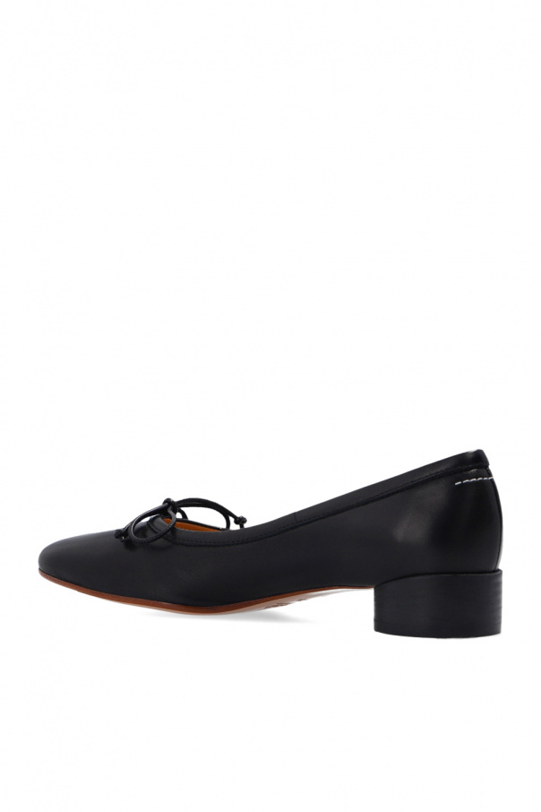 Black heeled ballet flats from MM6 Maison Margiela. Crafted from leather, this model sits on a beige leather sole and features an anatomical toe and a distinctive bow on the front.