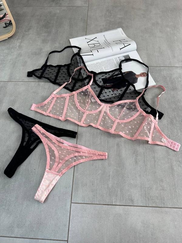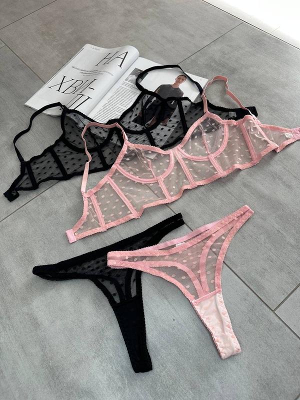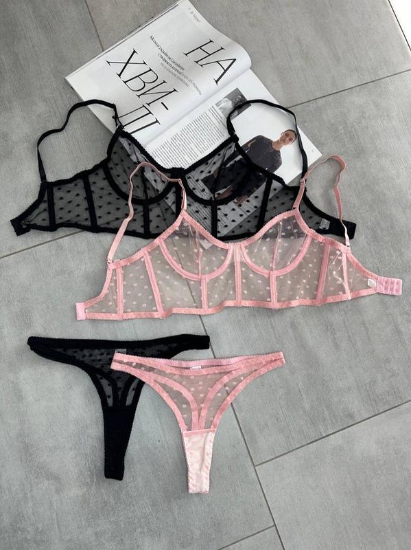 C015 (черные подвязки)Корсетный лиф из нежной сеточки в горошек и трусики стринги в черном цвете 🖤
