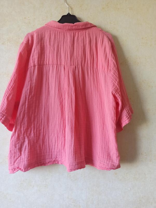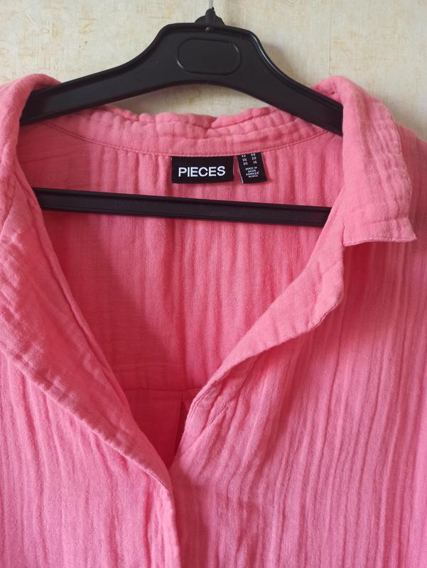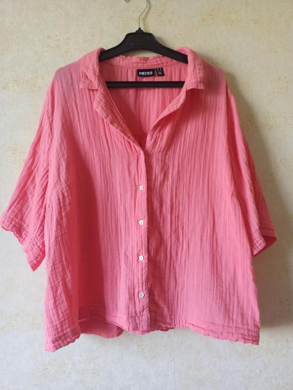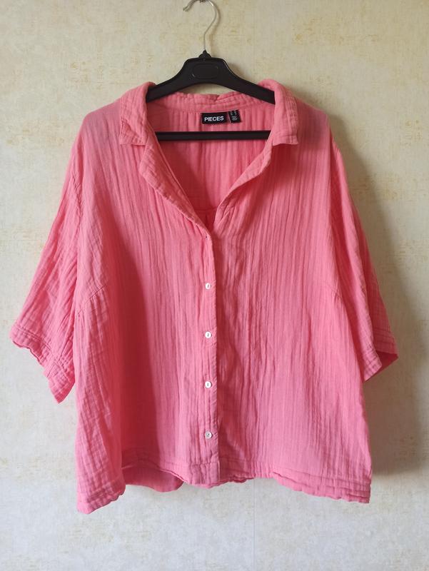 Очень красивая муслиновая укороченная рубашка, ткань 100% хлопок, мягкая на ощупь, приятная к телу. Красиво подходит как отдельный элемент верха к брюкам, джинсам, юбкам так и к платьям, как накидка-рубашка. Красивый теплый розовый цвет💗