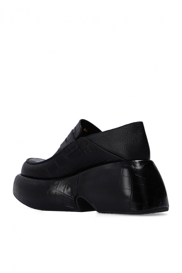 Black platform loafers from Loewe. Crafted from leather with a crocodile skin effect, this pair rests on a black rubber sole.
