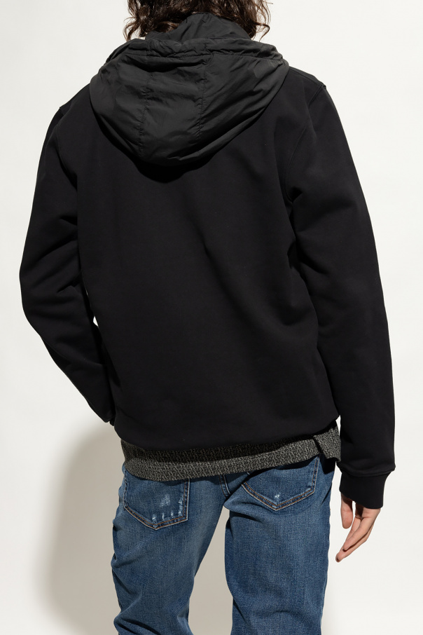 Black sweatshirt with a drawcord-adjustable hood from Woolrich. Crafted from organic cotton, this style features a standing collar with a quarter-zip closure, a white logo print on the front, a snap-fastened pocket and an elasticated bottom hem and cuffs.