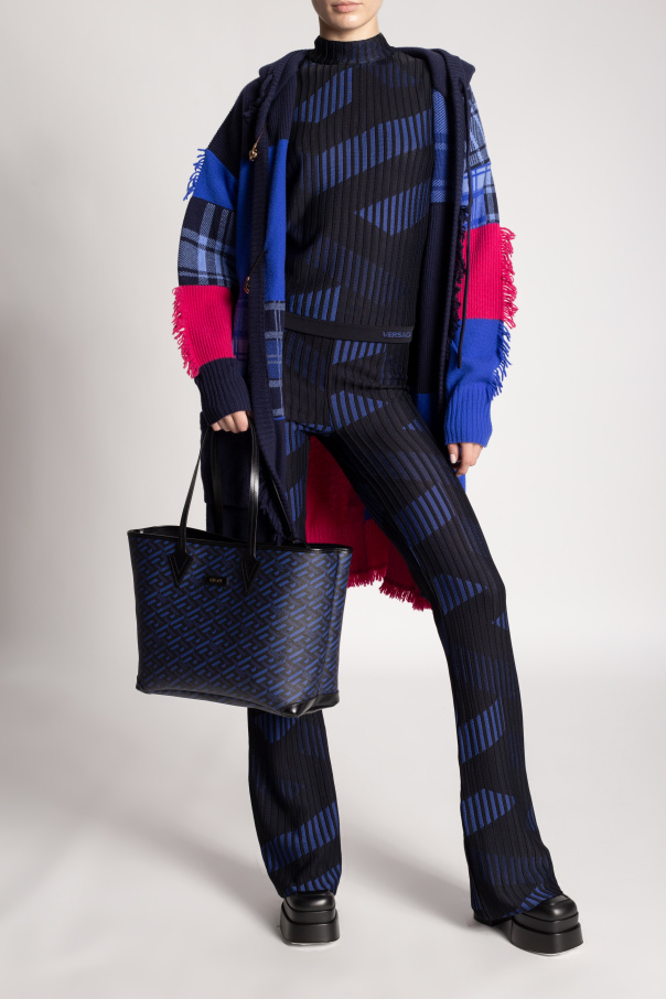 Black, blue and navy ‘La Greca’ shopper bag from Versace. Crafted from canvas with leather trims, this model features a logo print, the label’s signature Greek pattern, two half-round handles and one internal compartment with a detachable zipped pouch.