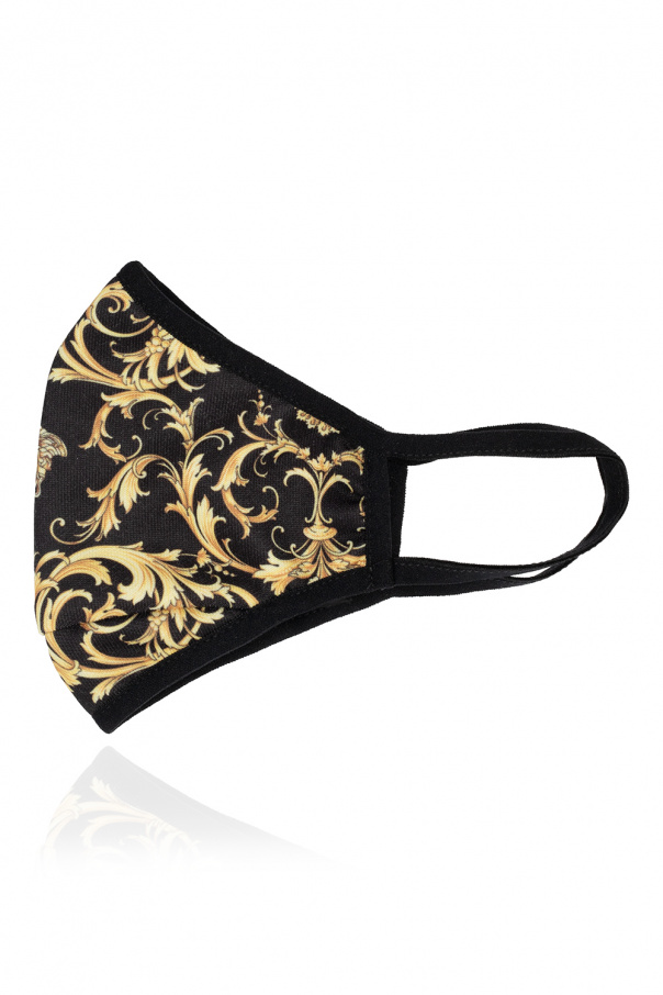 Black mask from Versace. Featuring a cotton lining, this item is decorated with the label’s signature orange Baroque print and Medusa head.