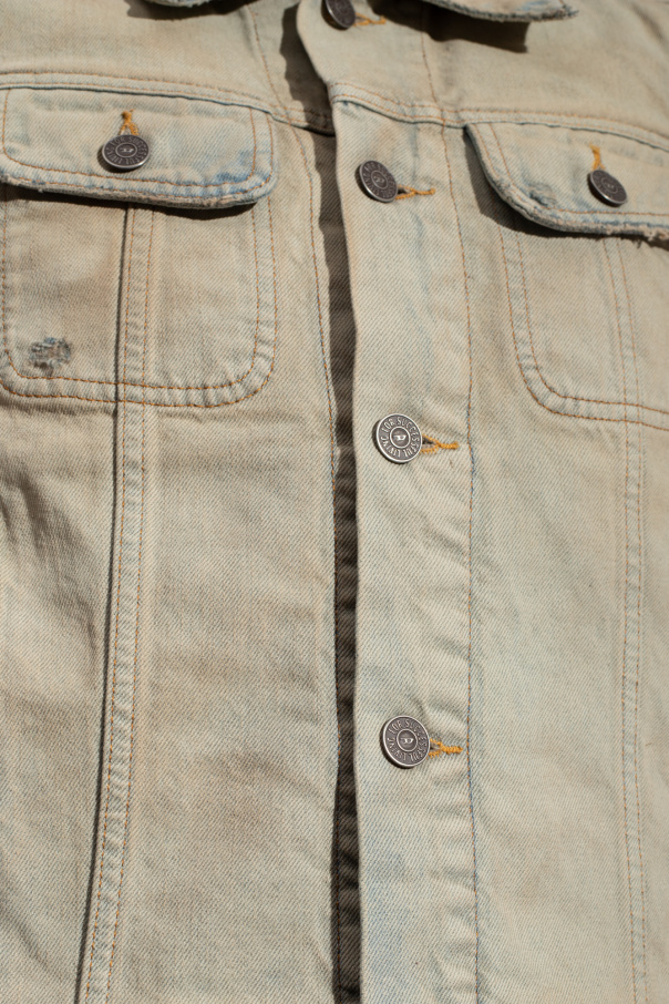 Beige and blue ‘DE-BONNY’ denim jacket from Diesel. Fastened with buttons, this design features a red logo embroidery, collar, two slip pockets, two zip pockets, raw trims, worn effect and long sleeves with vents.