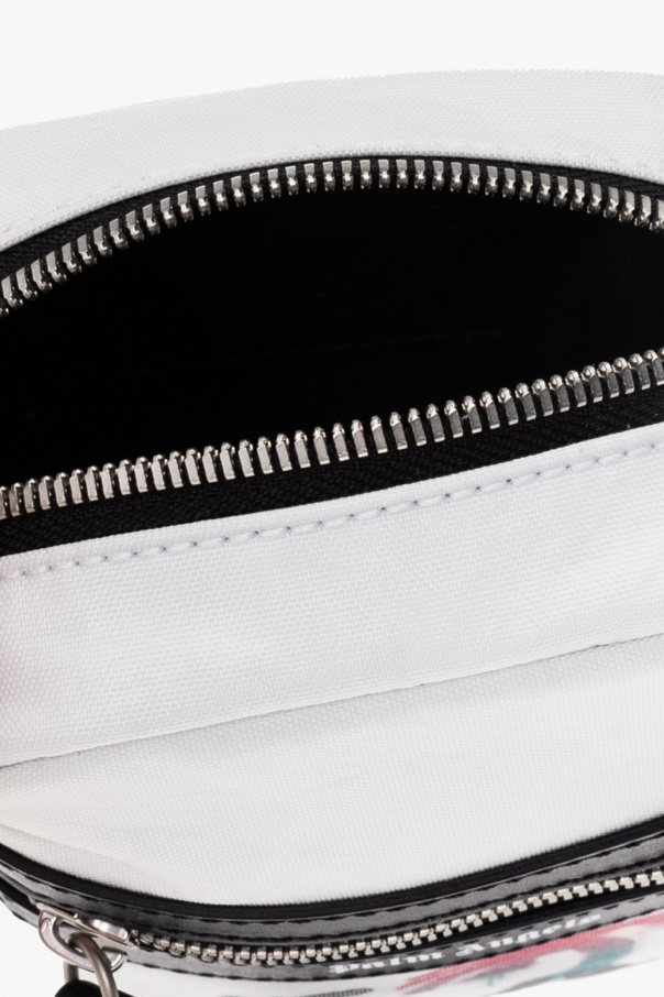 White shoulder bag from Palm Angels. Fastened with a zip, this model features a print, logo pattern, zip fastening, front zip pocket, shoulder strap, one internal compartment and silver-tone metal hardware.