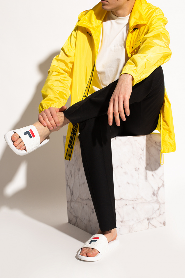 White ‘Baywalk’ slides from Fila. Resting on a white rubber sole, this pair is decorated with an embossed logo pattern.