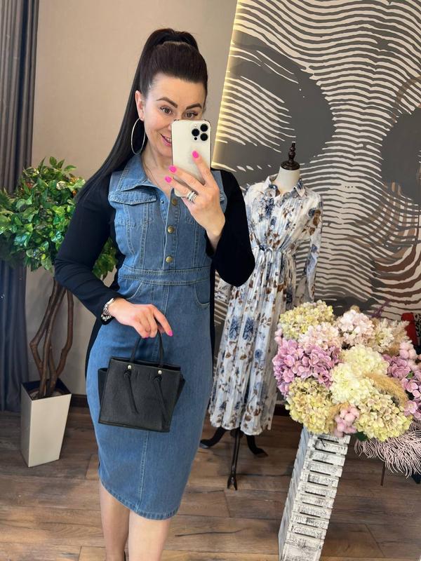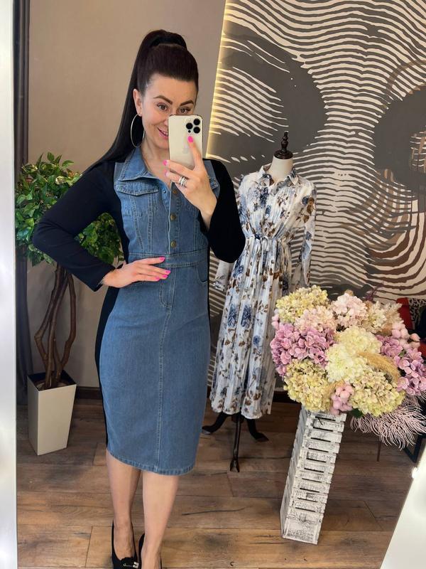 Модна і стильна новинка цього сезону сукня приталеного крою з довгими рукавами, невеликим відкладним коміром на кнопочках спереду, зручними кишенями з боків спереду і ззаду нижче талії, завершує образ практичний розріз ззаду, сукня виготовлена з трендового союзу двох тканин - щільного трикотажу і літнього деніму, вона відмінно сідає по фігурі, підкреслюючи її достоїнства,а такое добре поєднується з взуттям і аксесуарами різних кольорів і стилів