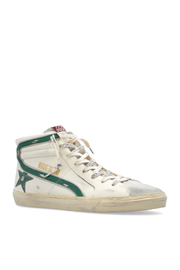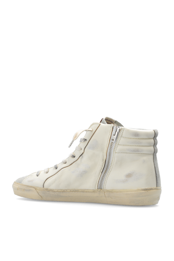 Cream ‘Slide Classic’ high-top sneakers from Golden Goose. Crafted from leather with a vintage effect, this lace-up model sits on a beige rubber sole and showcases the brand\'s signature star and a side zipper.