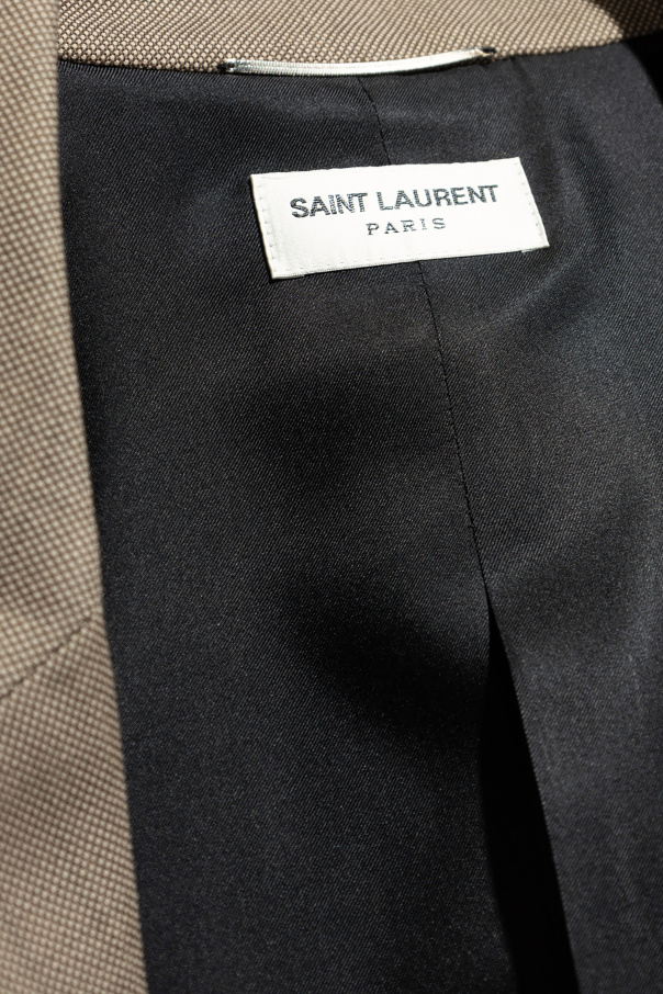 Introducing an exquisite addition to the discerning gentleman\'s wardrobe: the Beige Wool Blazer from the prestigious house of Saint Laurent. Crafted from 100% premium wool, this blazer epitomizes elegance and sophistication with its subtle yet refined texture and impeccable tailoring. Adorned in a versatile beige hue, the blazer effortlessly complements a myriad of styles and palettes, ensuring its status as a staple in any luxury collection. The blazer\'s classic cut, highlighted by sharp, pointed lapels and a single, contrasting button fastening, lends an air of formality while maintaining a casual grace. It features two flat pocket flaps at the hips and a neat chest pocket—a testament to its functional elegance. Distinctive details such as the designer\'s logo discreetly placed on the interior affirm the blazer\'s authenticity and lineage to the renowned Saint Laurent collection. Despite its clean lines and smooth back, without vents, the blazer promises comfort and unrestricted movement, making it an unparalleled choice for any occasion. Why Purchase This Product? Made of 100% high-quality wool, ensuring durability and warmth. Universally flattering beige color, easy to integrate into any wardrobe. Elegant design with subtle contrasts and refined details. Authenticity guaranteed with Saint Laurent\'s signature logo. An embodiment of timeless sophistication and casual elegance.