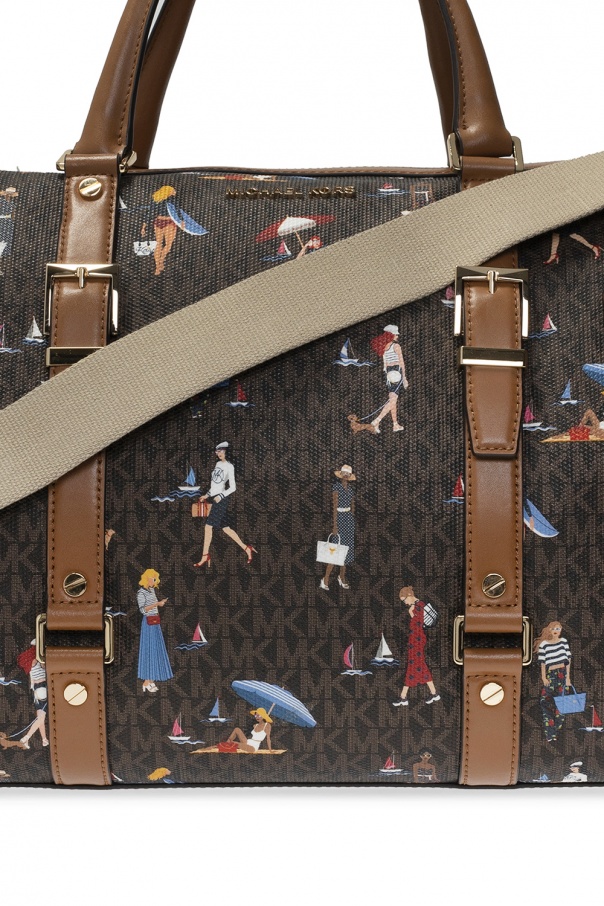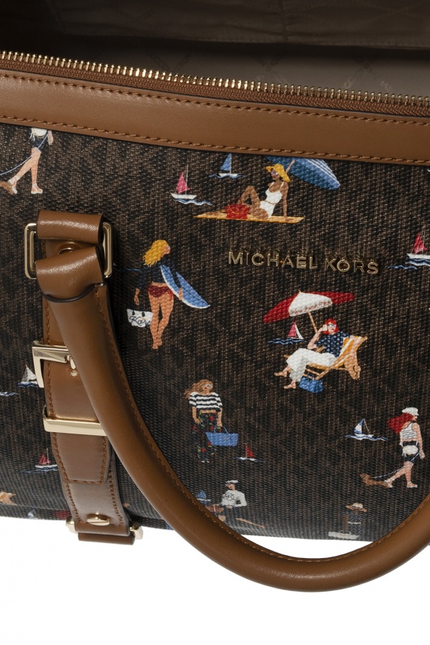 Brown weekender bag from Michael Michael Kors. Crafted from leather with leather trims, this design fastens via a two-way zip and features a colourful graphic print, a metal logo plaque, a pocket with magnetic closure on the back, snap-fastened pockets on the sides, two half-round handles, gold-tone metal hardware and one internal compartment with one zipped pocket and numerous slip pockets.