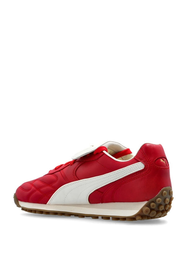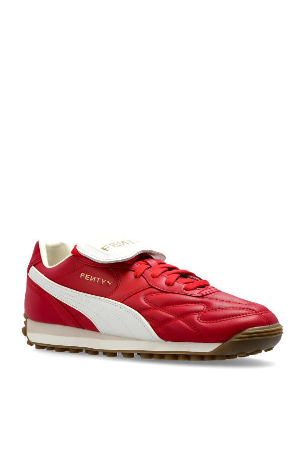 Introducing the PUMA x FENTY sneakers, a harmonious fusion of athletic allure and sophisticated craftsmanship. These low-profile, classic sneakers are meticulously designed to offer an unparalleled visual experience. Crafted with an exquisite leather exterior, these sneakers boast a vivid red hue complemented by subtle white accents. Intricate stitching patterns embellish the surface, further enhancing their unique allure. The rounded toe and sleek silhouette ensure a timeless appeal. The sneakers feature a distinctive white lace guard adorned with the \"FENTY\" name and the iconic PUMA logo in opulent gold, a testament to their exclusive collaboration. The sturdy rubber sole with a visible tread pattern guarantees unmatched grip and durability. Why Choose This Product? Expertly reimagined by Rihanna, blending iconic archive design with modern elegance. Luxurious leather finish with complementary stitching and laces. Striking FENTY x PUMA branding in gold enhances its exclusivity.