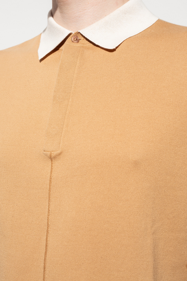 Light brown and cream polo shirt from PS Paul Smith. Made of organic cotton from sustainable farms, this garment features a buttoned collar with a concealed placket, short sleeves with a logo embroidery and ribbed trims at the hem and cuffs.