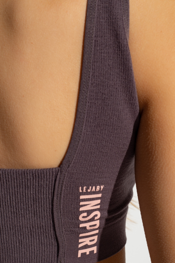 Greyish purple ribbed seamless sports top from Maison Lejaby. Made of plant-based fibers, this V-neck design is decorated with a light pink logo print.