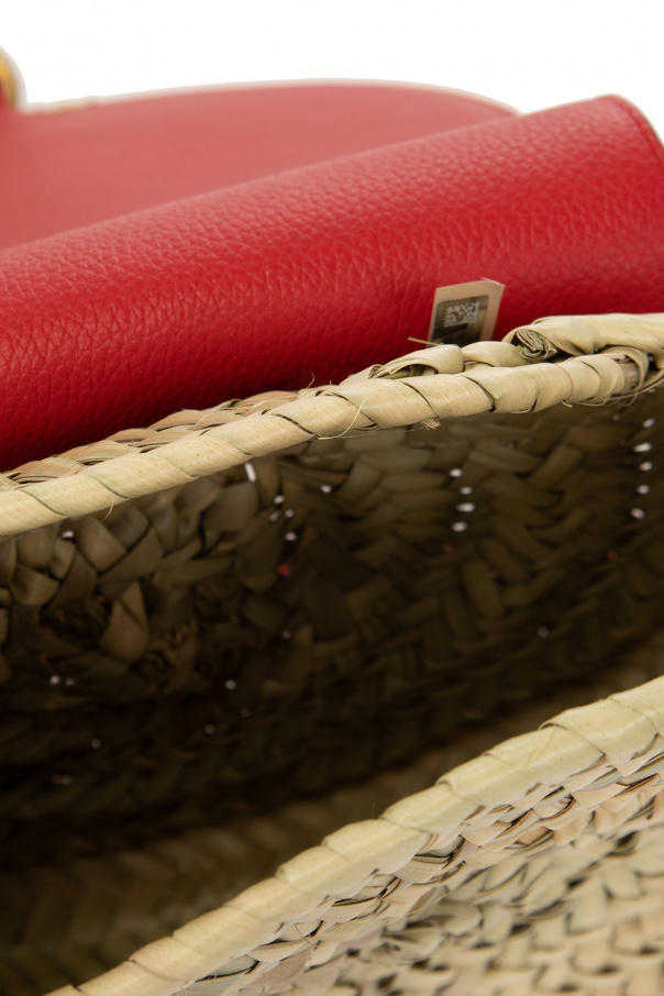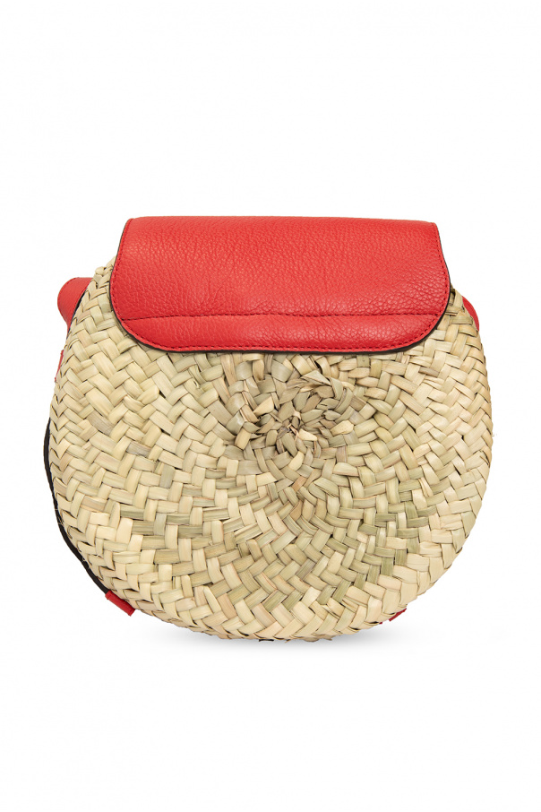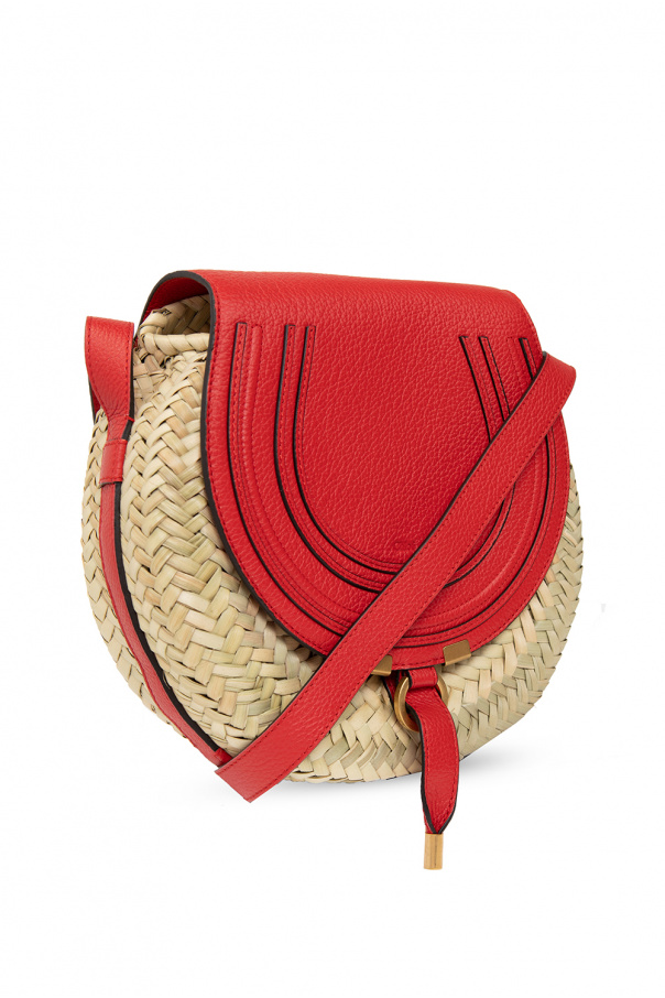 Beige and red ‘Marcie Small’ shoulder bag from Chloé. Made of hand-woven palm leaves with calf leather trims, this model features a decorative closure, stitching details, embossed logo, adjustable shoulder strap, one internal compartment and gold-tone metal hardware.