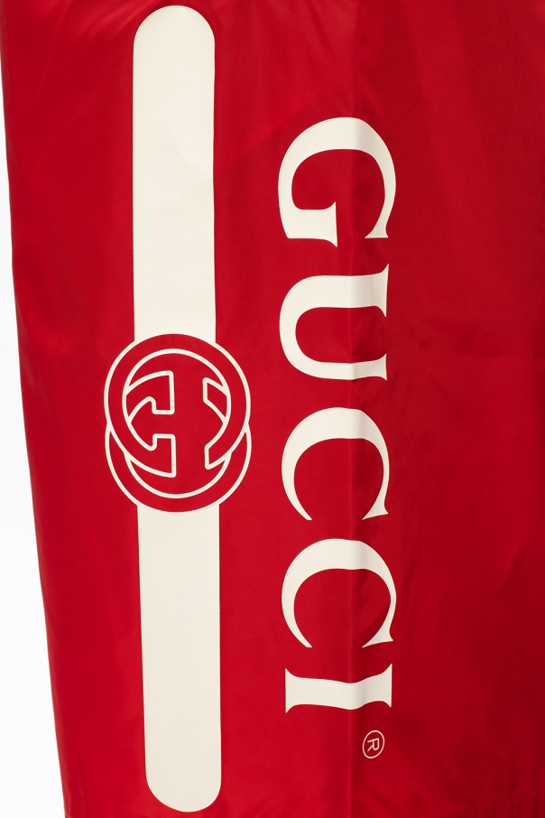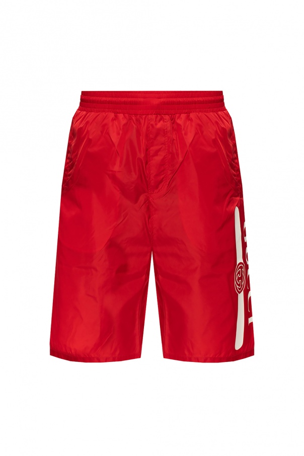 Red swim shorts from Gucci featuring a drawstring waist, a white logo print and two slip pockets.