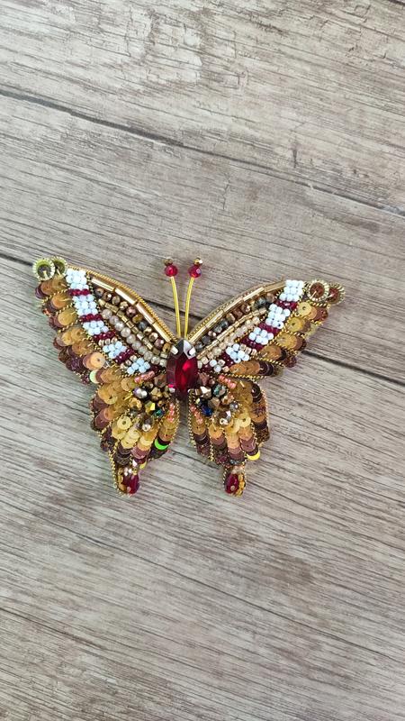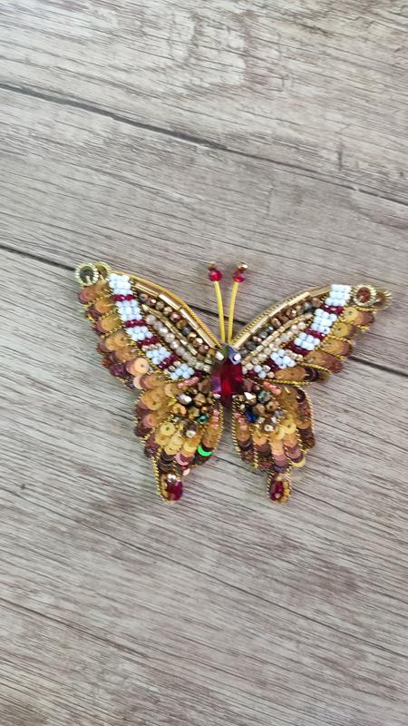 Брошка Метелик вишита пайєтками, намистинами, кристалами, рожевого кольору. Зворотня сторона шкіра. Застібка може бути шпилька чи магніт.