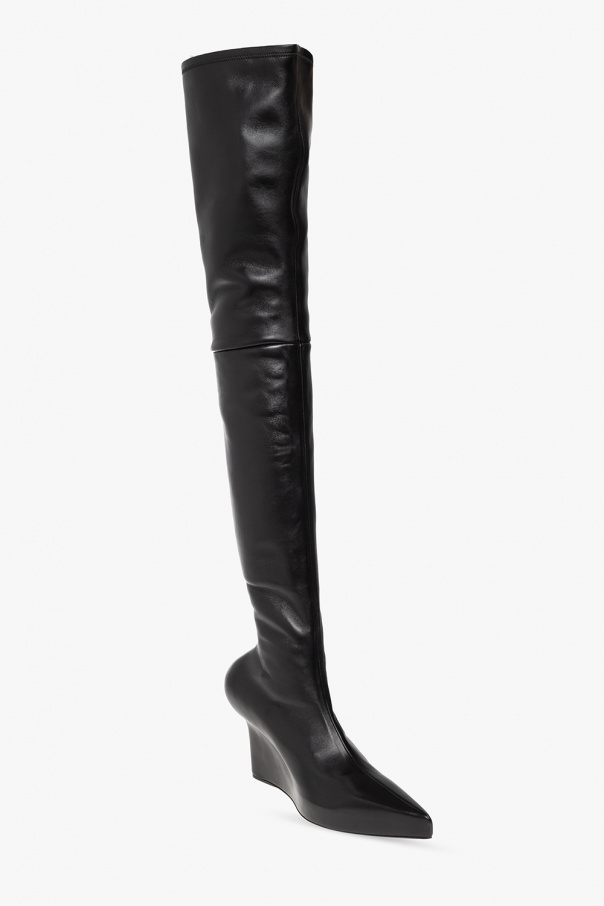 Black wedge boots from Givenchy. Made of lamb leather, this pair features a side zip, fitted thigh-high upper, pointed toe and black leather sole.