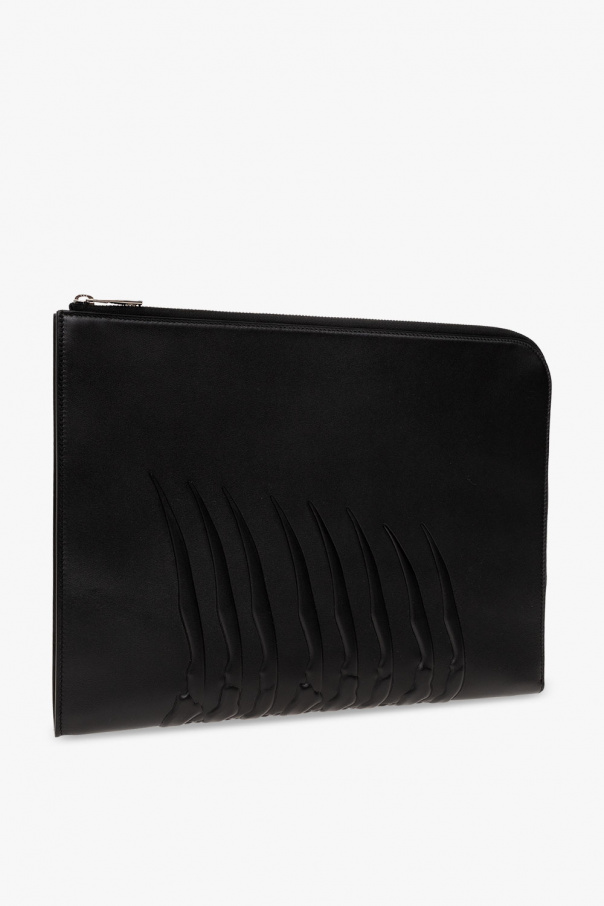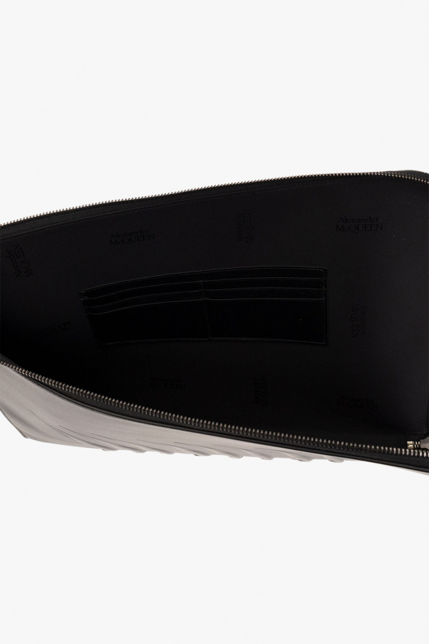 Black briefcase from Alexander McQueen. Made of leather, this model features a zip fastening, raised logo, silver-tone metal hardware and one internal compartment with one slip pocket and six card slots.
