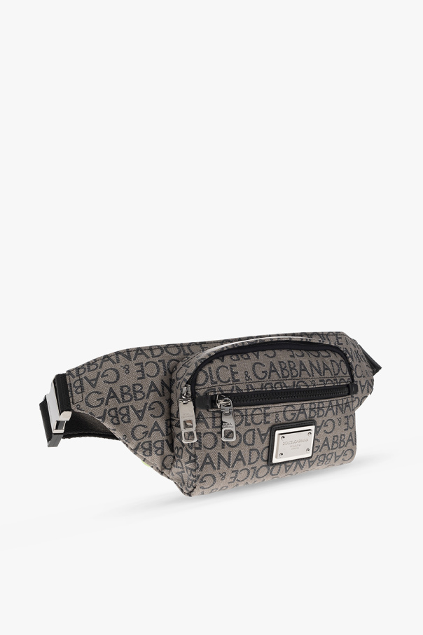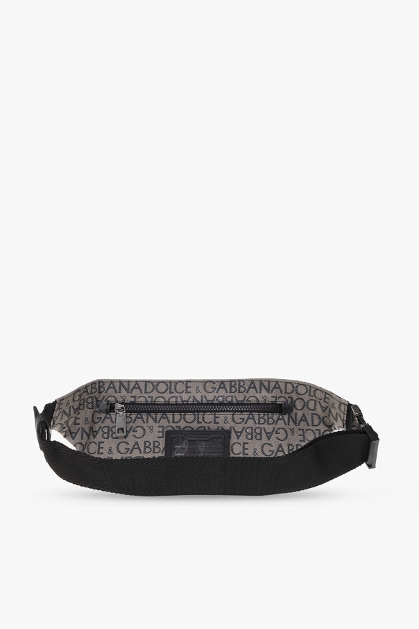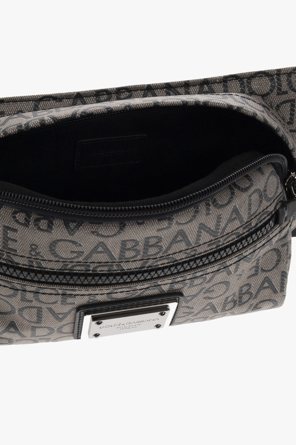 Beige and black belt bag from Dolce & Gabbana. Made of canvas with a monogram pattern and calf leather trims, this design features a two-way zip, front zip pocket, logo detail, back pocket, adjustable belt and one internal compartment.