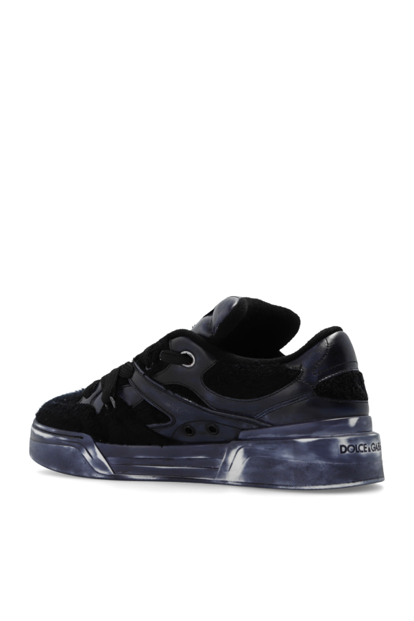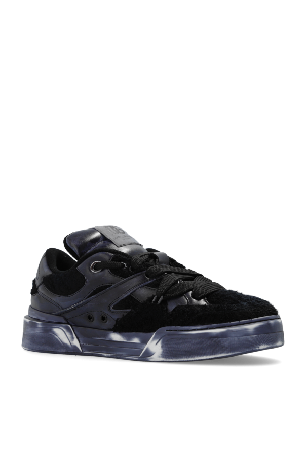 Navy, black and white ‘New Roma’ sneakers from Dolce & Gabbana. Crafted from leather with a vintage effect and terry fabric, this lace-up pair features a logo patch on the tongue, perforations on the front and rubber sole in blue and white.