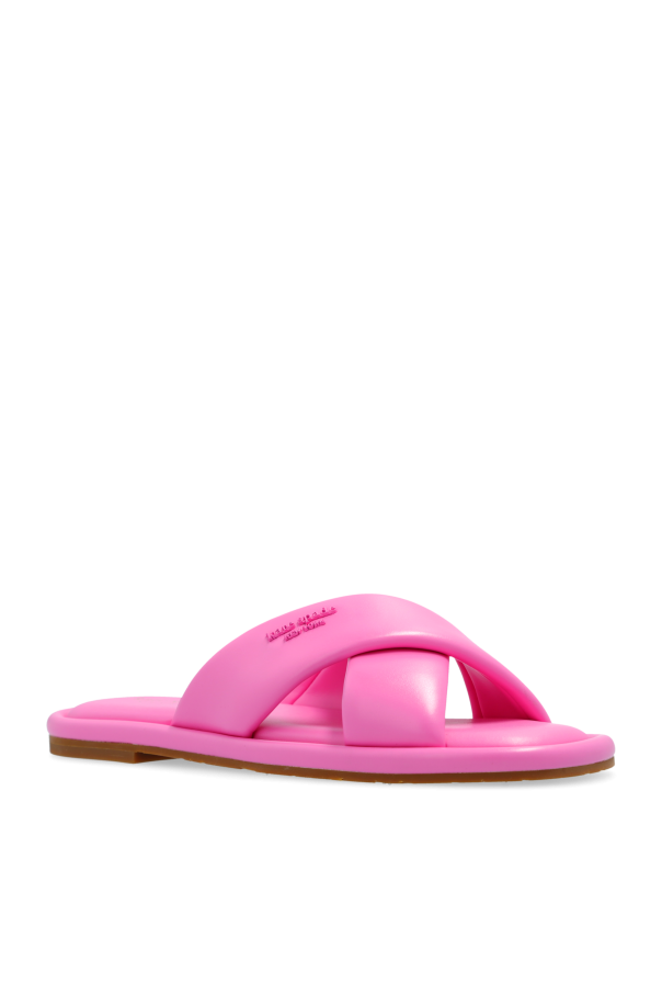 Introducing the epitome of modern elegance and comfort, the Kate Spade Logo Slides. Crafted with meticulous attention to detail, these slides present a seamless blend of style and functionality. The singular, wide strap that gracefully arcs over the instep is fashioned from a smooth, possibly synthetic material, offering an uncluttered, minimalist aesthetic. Highlighted by the discreet, embossed or printed Kate Spade logo near the toe, these slides are a testament to refined branding and design. Rendered in a captivating shade of pink, these slides are not just footwear; they\'re a statement. The all-gum composition, encompassing the outer layer, inner layer, and sole, ensures a unified look while providing unparalleled comfort and durability. The flat sole, subtly contoured at the toes, promises ease and wearability for any occasion. Why Purchase This Product? Exclusively designed by Kate Spade, ensuring a blend of luxury and authenticity. Minimalist design with a focus on comfort, featuring a wide, smooth strap and a contoured flat sole. Premium gum material construction offers lasting durability and ease of care. Vibrant pink hue and elegant logo detailing make these slides a versatile addition to any wardrobe, effortlessly transitioning from casual daywear to chic evening attire.