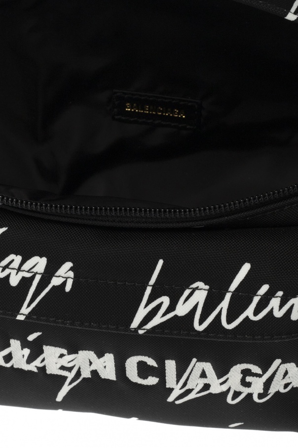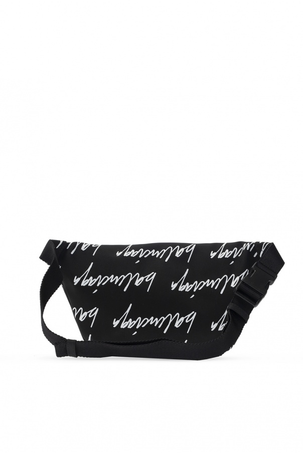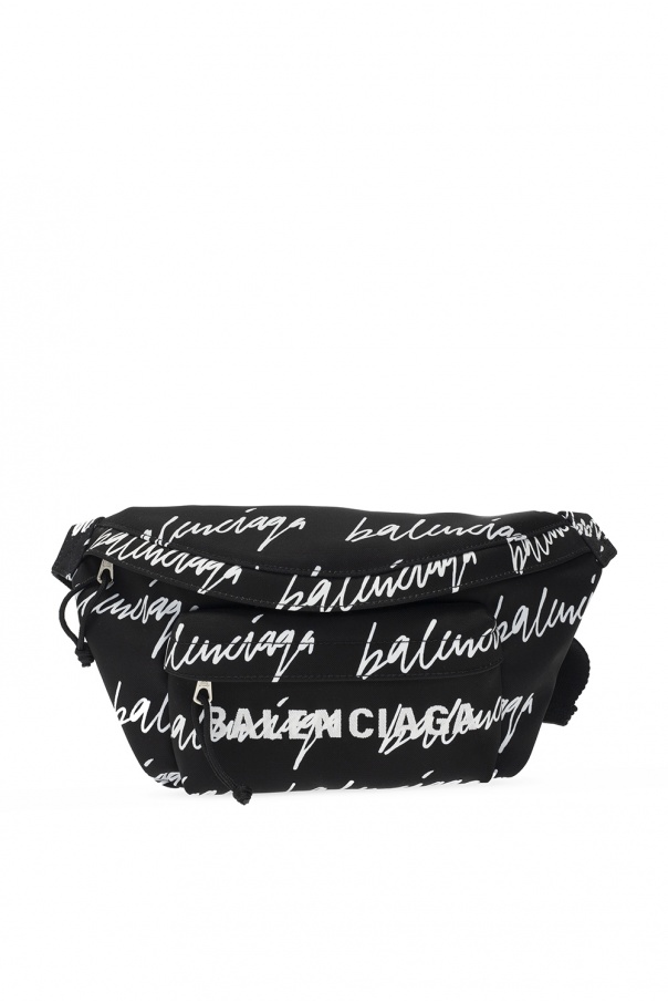 Black ‘Wheel’ belt bag from Balenciaga. Fastened with a zip, this design features a white logo print, front zip pocket, adjustable shoulder strap and one internal compartment.