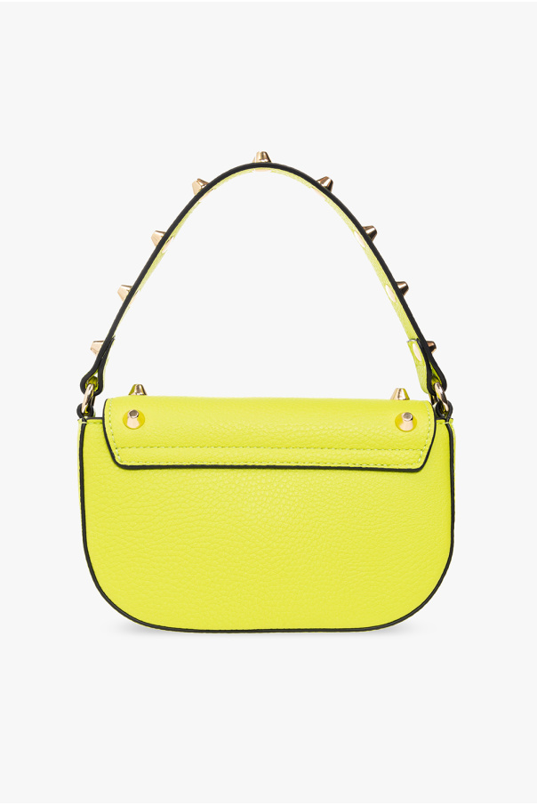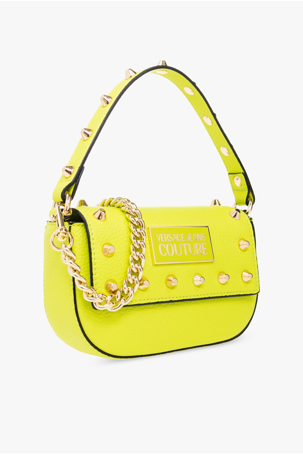 Neon green shoulder bag from Versace Jeans Couture. Crafted from faux leather with a grain texture, this design secures with a snap and showcases stud embellishments and logo hardware on the flap, a short handle, a detachable chain strap, gold-tone metal elements and one internal compartment.